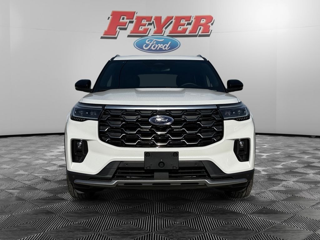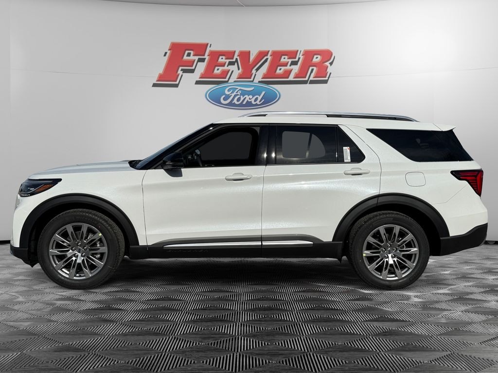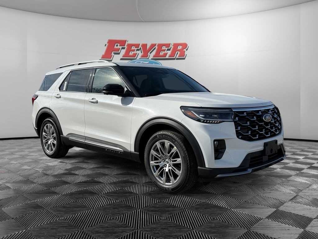 Star White Metallic Tri-Coat 2026 Ford Explorer Platinum RWD 10-Speed Automatic 2.3L EcoBoost I-4 Pre-Collision Assist with Automatic Emergency Braking w/Pedestrian Detection, Adaptive Cruise Control/Lane Centering System, BlueCruise, Bluetooth (Handsfree) Phone, Ford Digital Experience, Google Assistant, Google Maps, Google Play, Waze Navigation Integration, Apple CarPlay® and Android AutoTM Wireless Compatibility, 13.2" Color LCD Touchscreen, Alexa Built-In, SiriusXM Satellite Radio, Voice Controlled iPod/Mp3 input/USB port, Ford CoPilot 360, Heated/Cooled Front Seats, Heated Rear Seats, Keyless Entry Keypad, 911 Assist, 360-Degree Camera, Lane Keeping System, Automatic High-Beam Headlamps, FordPass Connect w/5G Modem, Wi-Fi Hotspot, 2nd Row Captain's Chairs, Wireless Charging Pad, Blind Spot Information System (BLIS), Rain-Sensing Windshield Wipers, Rear View Camera, Explorer Platinum, ActiveX Trimmed Captain's Chairs, Auto High-beam Headlights, Equipment Group 600A Standard Package, Front dual zone A/C, Garage door transmitter, Heated steering wheel, Knee airbag, Memory seat, Navigation System, Panoramic Fixed Glass Roof with Power Shade, Power Liftgate, Radio: B&O Sound System by Bang & Olufsen with HD, Rain sensing wipers, Rear air conditioning, SecuriCode Keyless Entry Keypad, Wheels: 20" Luster Nickel-Painted Aluminum.